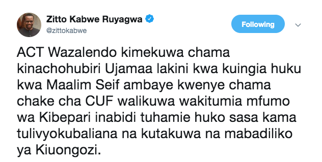 Zitto kupitia ukurasa wake wa Twitter ameandika “ACT